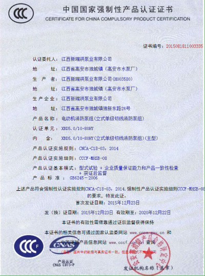 热烈祝贺新瑞洪泵业获得国家消防强制认证(CCCF)认证!!!